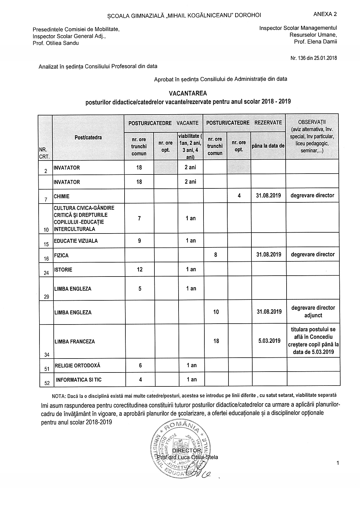 Vacantarea posturilor didactice/catedrelor vacante/rezervate pentru anul școlar 2018-2019